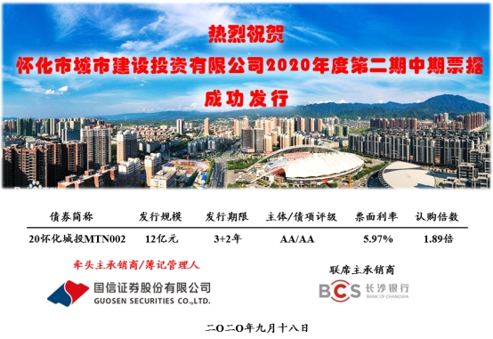 近日,懷化市城市建設(shè)投資有限公司在銀行間市場交易商協(xié)會成功發(fā)行2020年度第二期中期票據(jù)(簡稱“20懷化城投MTN002”),發(fā)行規(guī)模人民幣12億元,期限3+2年,票面利率5.97%。