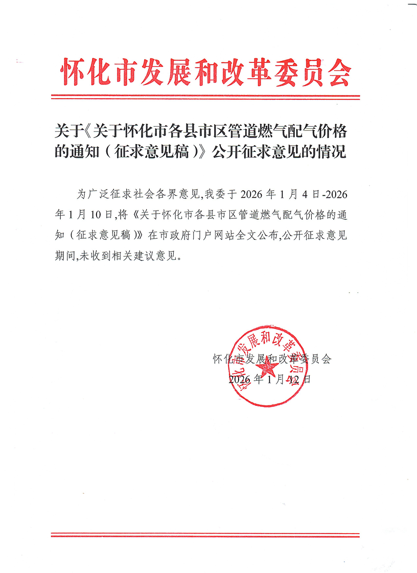關于《關于懷化市各縣市區(qū)管道燃氣配氣價格的通知(征求意見稿)》公開征求意見的情況