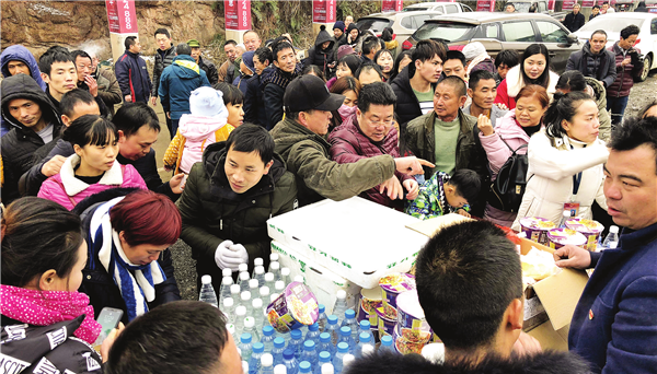 1月28日,洪江市組織工作人員在邵懷高速公路安江出口為被困乘客免費(fèi)發(fā)放餅干、方便面和飲用水等食品。由于嚴(yán)寒低溫天氣,邵懷高速洪江市路段大面積結(jié)冰,安江出口20 余輛大巴車(chē)被困。該市立即調(diào)撥救援物資,幫助被困群眾。(楊錫建 向華 攝)