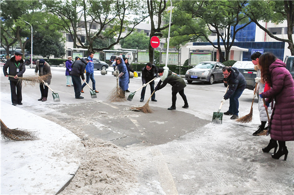 1月26日,市第一人民醫(yī)院的黨員志愿者與醫(yī)務(wù)人員在醫(yī)院內(nèi)鏟除冰雪,確保行人安全通行。 (曾悅 攝)