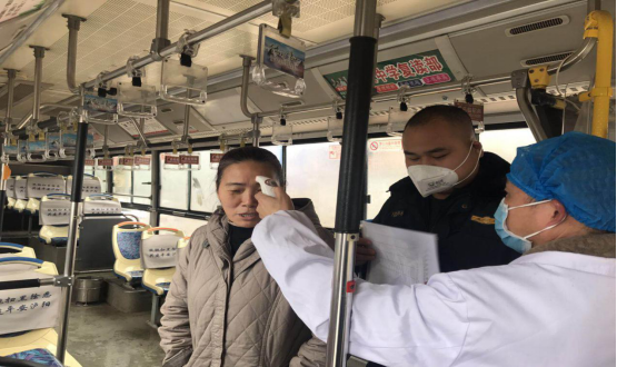 圖一:執(zhí)法人員與衛(wèi)健部門對公交乘客測體溫