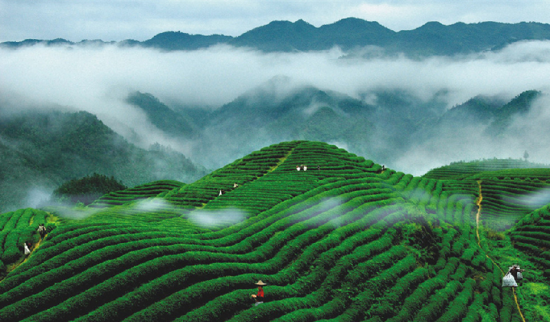 在碣灘山的山坡上,坐落著3000余畝蓊郁青翠的碣灘茶園,茶園綠染碣灘兩岸,有“栽培布局奪天工,碧毯陳鋪十五峰,唯有碣灘茶最好,知音海外話田中”之贊語(yǔ)。碣灘茶香遍全球,歷史久遠(yuǎn),在唐代已成為貢茶,歷久不衰。`1972年,當(dāng)時(shí)的日本首相田中角榮來華訪問,曾向周恩來總理夸贊碣灘茶,并稱之為“中日友好之茶”。