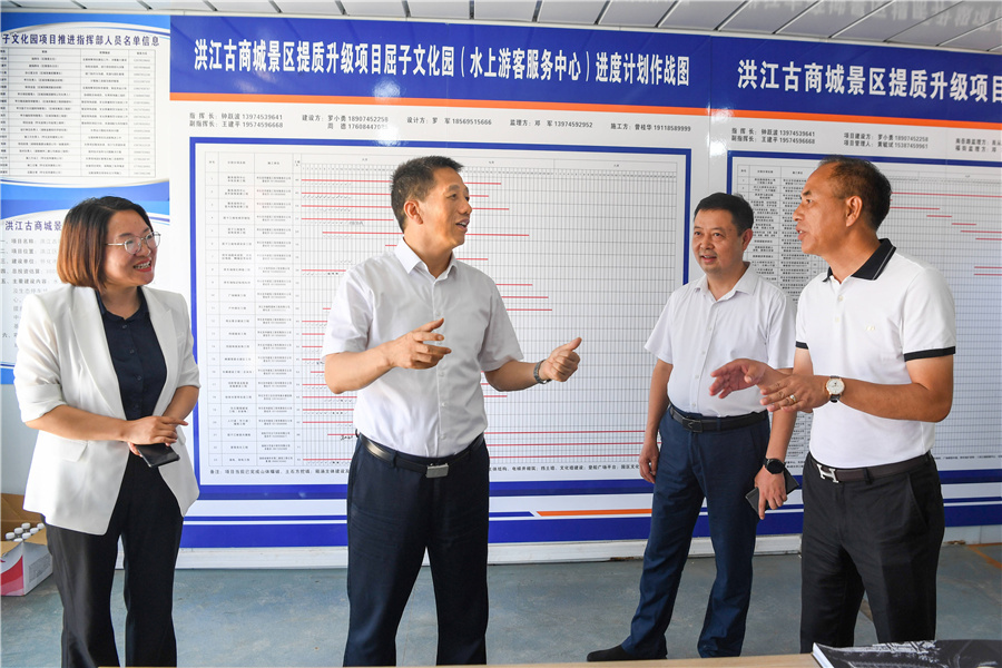 (許忠建在洪江古商城了解屈子江閣、水上游客服務(wù)中心等景區(qū)提質(zhì)改造項(xiàng)目進(jìn)展情況。以上照片均由懷化日報(bào)全媒體記者 楊智偉 攝)
