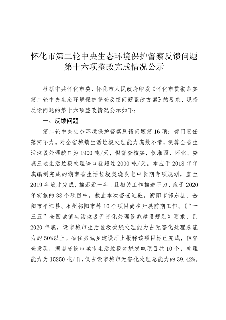 懷化市第二輪中央生態(tài)環(huán)境保護(hù)督察反饋問(wèn)題第十六項(xiàng)整改完成情況公示