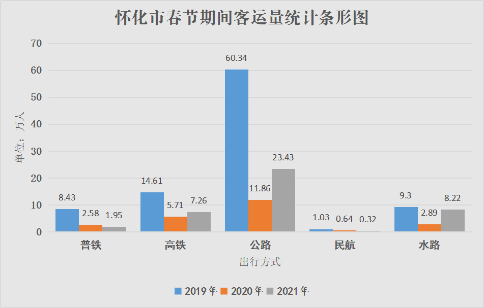春節(jié)假期期間,懷化市綜合交通發(fā)送旅客41.18萬人,同比2020年上升74.02%,同比2019年下降61.1%。其中普鐵1.95萬人,同比2020年下降24.31%,同比2019年下降76.86%;高鐵7.26萬人,同比2020年上升27.22%,同比2019年下降50.32%;公路23.43萬人,同比2020年上升102.16%,同比2019年下降61.17%;水路8.22萬人,同比2020年上升184.92%,同比2019年下降11.62%;芷江機場3165人,同比2020年下降50.07%,同比2019年下降69.41%。受疫情影響,今年春節(jié)期間群眾出行旅游大幅減少,大部分市民選擇在懷就地過年,高速公路偶有堵塞現(xiàn)象,公路、水路客流量有所回暖,但未達(dá)到正常水平,部分普鐵線路停運,往年最熱鬧的高鐵客流量也有所減少。全市春運總體平穩(wěn)、安全、有序。(市春運辦 劉二華)