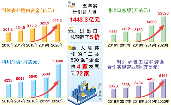 五年累計引進(jìn)內(nèi)資1443.3億元,進(jìn)出口總額翻了5倍,入駐懷化的“三類500強(qiáng)”企業(yè)由4家發(fā)展到72家——