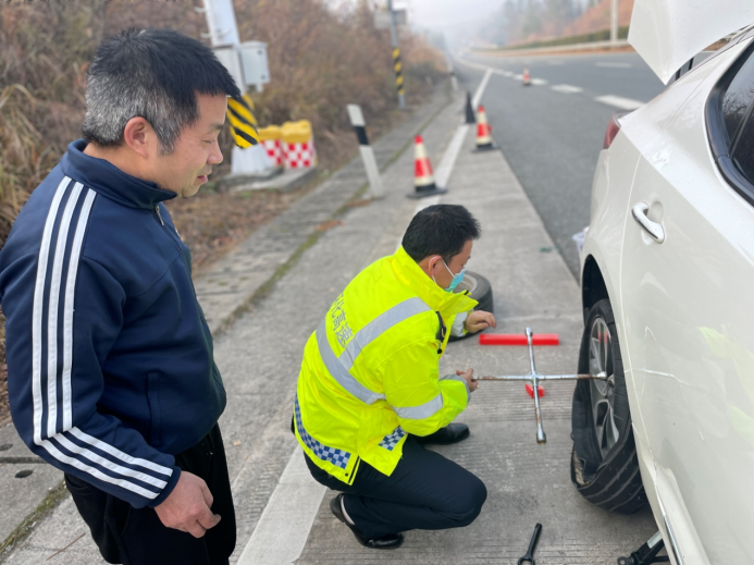春運(yùn)第一天,高速公路上車流量明顯增加,懷化西管理所巡查人員江揚(yáng)、于楓起了個大早,開始了一天的巡查工作。9時許,巡查至G65包茂高速懷化段K2187南往北時,發(fā)現(xiàn)一輛小車因右后輪爆胎停在緊急停車帶。由于駕駛員沒有換胎經(jīng)驗(yàn),正焦急地站在車旁,手足無措。巡查人員了解情況后,立即用隨車維修工具幫助司機(jī)更換輪胎,不到5分鐘就將備胎換上,幫助駕駛員再次踏上旅途。