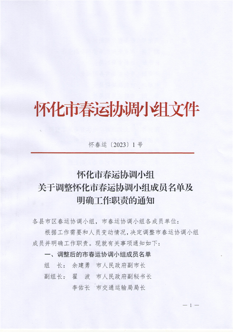 懷春運(yùn)〔2023〕1號(hào) 關(guān)于調(diào)整懷化市春運(yùn)協(xié)調(diào)小組成員名單及明確工作職責(zé)的通知