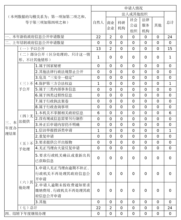 嚴(yán)格執(zhí)行政府信息公開(kāi)條例有關(guān)依申請(qǐng)公開(kāi)的規(guī)定,依法辦理政府信息公開(kāi)申請(qǐng)件。全年收到9件線上信息公開(kāi)申請(qǐng)、15件線下信息公開(kāi)申請(qǐng),均已按時(shí)辦結(jié)。在行政復(fù)議、訴訟方面,也未收到有關(guān)政府信息公開(kāi)的行政復(fù)議申請(qǐng),也未發(fā)生關(guān)于政府信息公開(kāi)的行政訴訟案件。
