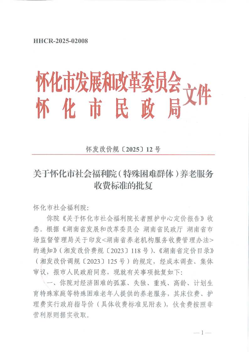 關(guān)于懷化市社會(huì)福利院(特殊困難群體)養(yǎng)老服務(wù)收費(fèi)標(biāo)準(zhǔn)的批復(fù)