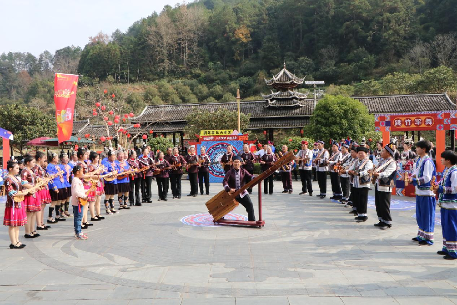 1月14日,通道侗族自治縣雙江鎮(zhèn)向暉村紅色文化廣場,群眾興高采烈地開展高腳馬“賽馬”比賽。