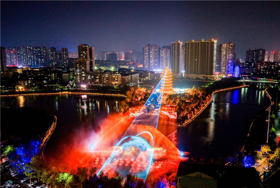 鶴城區(qū)鶴鳴洲燈火如晝 太平溪河畔流光溢彩